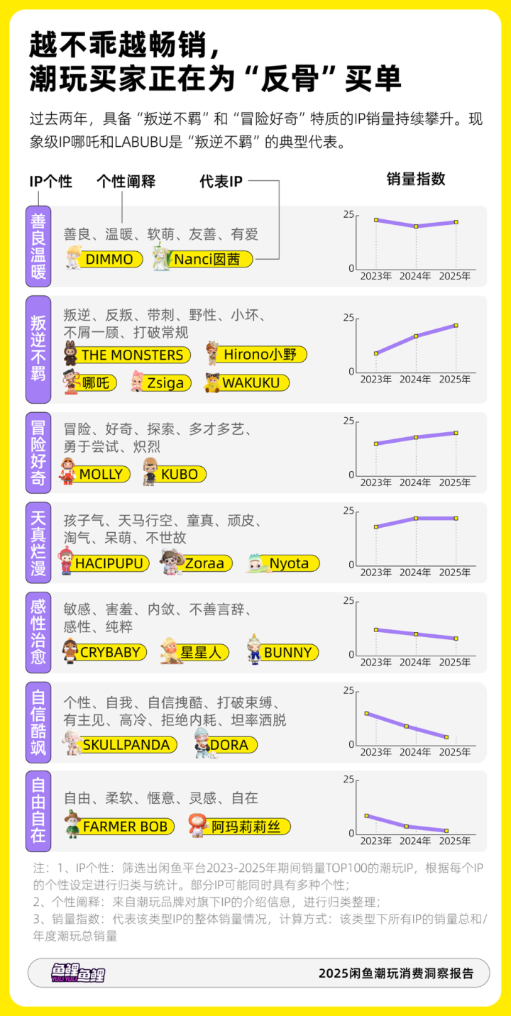 报告研究了过去三年闲鱼平台销量TOP100的潮玩IP,发现THEMONSTERS(LABUBU)、Hirono小野、哪吒、Zsiga等IP销量持续攀升。在行业看来,潮玩作为典型的情绪消费,不同时期的畅销IP反映出消费者的情感投射。相比过去,当下潮玩爱好者更愿意为“叛逆不羁”买单。